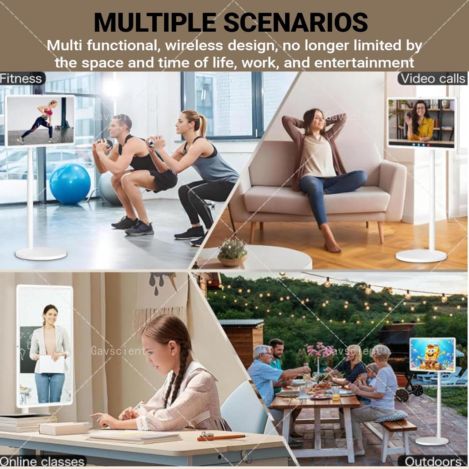 Having this big tablet, having a new way of life and work.The powerful 8-core CPU andof large memory provide a smooth user experience. The large battery and pulley base allow you to carry it around, whether indoors or outdoors. The 21.5/32 inch large screen, and rich interfaces allow you to expand into more new scenarios such as live streaming and office work.Different from traditional screens or TVs, the smart screen comes with universal wheels that follows you wherever you go.One screen integrates functions such as long battery life, multi-terminal screen projection and rotation, completely getting rid of the shackles of cables, meeting your needs in living rooms, bedrooms, kitchens, and even offices, campsites and other venues, providing you with a new viewing experience anywhere, anytime, and at will.Specification:Memory+RAM:4/64GB,4/128GB,8/128GBTouch Screen: 10 points capacitive touchResolution: 1920*1080Viewing Angle: ±90° screen rotation,±20° pitch adjustmentBuilt-in Battery Capacity: 6000mAhBattery Life: 3-4 hoursPacking List:1x Monitor1x Stand1x Power ada-pterNotes:1.Due to manual measurement, the size error is 1-3cm. Errors may occur, please refer to the actual product.2.Due to shooting and environmental reasons, the color is subject to the actual product.