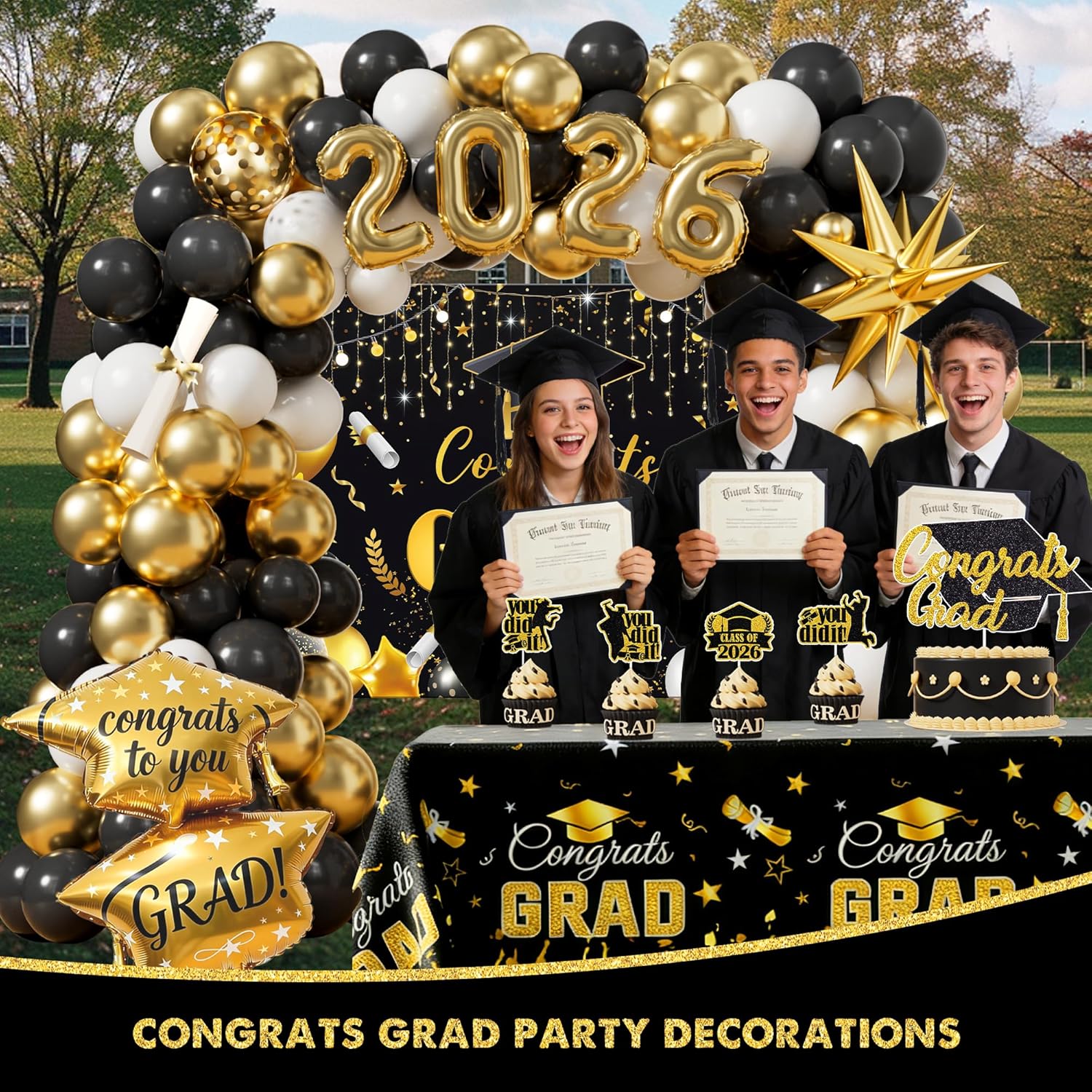 Celebrate your graduate in style! Our Class of 2026 Graduation Party Decorations Kit is perfect for creating a chic, memorable, and picture-perfect celebration.🎓 Black & Gold Graduation Party Set – Includes Everything You Need: 6 x 12'' gold glitter balloons | 32 x 10" black balloons | 27 x 10" white balloons | 27 x 10" metallic gold balloons | 8 x 5" black balloons | 8 x 5" white balloons | 8 x 5" metallic gold balloons | 4 x black balloon boxes | 7 x balloon box cutouts | 1 x 'CONGRATS GRAD' banner | 1 x 'Class of 2026' backdrop | 1 x cake topper | 9 x cupcake toppers | 1 x '2026' foil balloons | 1 x graduation cap foil balloon | 1 x graduation cap foil balloon | 1 x graduation tablecloth | balloon arch strip | ribbons | glue dotsPerfect For: High school or college graduation parties, senior night celebrations, graduation photo backdrops, and all Class of 2026 themed events.⚠Helpful Tips: ⚠1. Balloon colors may vary slightly due to lighting, camera settings, or screen displays.2. This kit comes with all the essential accessories—no extra purchases needed.3. For faster and easier balloon garland setup, we recommend using a balloon pump.🎉 Make your Class of 2026 graduation party unforgettable! This black and gold decorations kit helps you create a stunning photo backdrop and celebrate your graduate’s success in style.