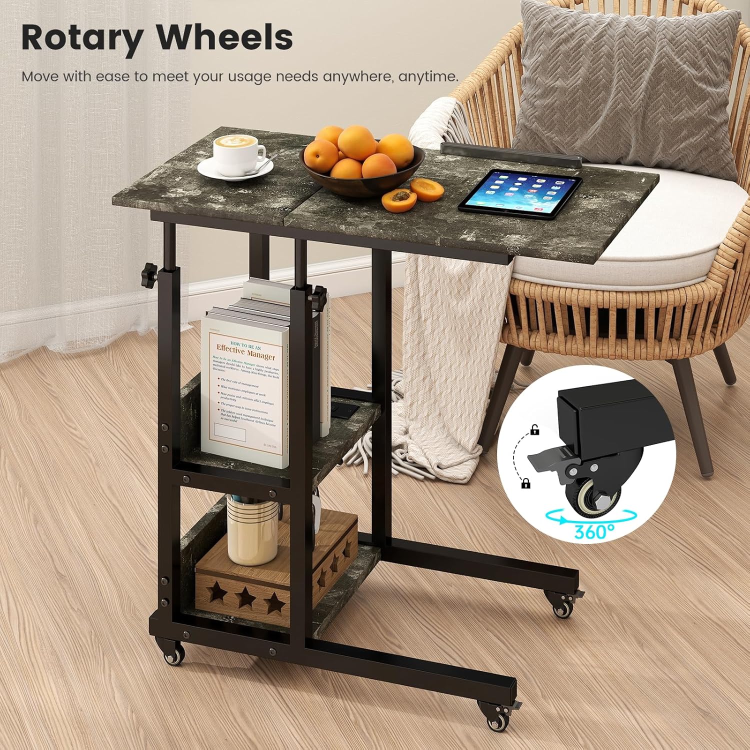 Elevate your living space with the Height Adjustable C-Shaped End Table in Marble Gray, a stylish and functional addition to any room. Designed for versatility and convenience, this end table is perfect for use beside your sofa, bed, or desk, offering a seamless blend of form and function. Featuring an adjustable height ranging from 26 inches to 34.5 inches, this C-shaped table can be customized to suit your specific needs—whether you're working, relaxing, or enjoying a meal. The tilt-able tabletop allows you to adjust the angle from 0° to 45°, making it ideal for reading, drawing, or working on your laptop. A built-in paper stopper ensures your items stay secure, even when tilted. Equipped with a built-in charging station, this table includes 3 outlets and 2 USB ports, keeping your devices powered up and within reach. The 4.9-foot power cord offers flexibility, while four swivel casters (two with brakes) make it easy to move around without damaging your floors. Its space-saving design makes it perfect for small spaces, fitting snugly under sofas or beds while providing extra storage with two convenient shelves. The durable construction features high-grade particleboard and a thick metal frame, ensuring long-lasting stability and strength. With easy assembly taking just about 30 minutes, this table is ready to enhance your home quickly. The Marble Gray finish adds a modern and elegant touch, complementing a wide range of interior styles. Whether you're looking for a practical solution or a stylish accent piece, the Height Adjustable C-Shaped End Table in Marble Gray is the perfect choice for your home.