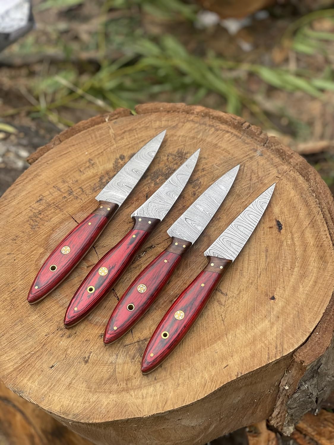 Elevate your culinary experience with this handmade Damascus steel kitchen steak knife set. Crafted by skilled artisans, each knife features a stunning pattern of Twist Pattren Damascus steel, creating a striking blend of strength and beauty. The razor-sharp blades effortlessly slice through the toughest cuts, while the ergonomic handles provide a comfortable and secure grip. This set includes a leather bag for safe storage and transportation, making it a perfect choice for home chefs, outdoor enthusiasts, or anyone who appreciates the art of fine cutlery. With its exceptional craftsmanship and timeless design, this Damascus steel knife set is a true culinary treasure that will elevate your dining experience for years to come.
