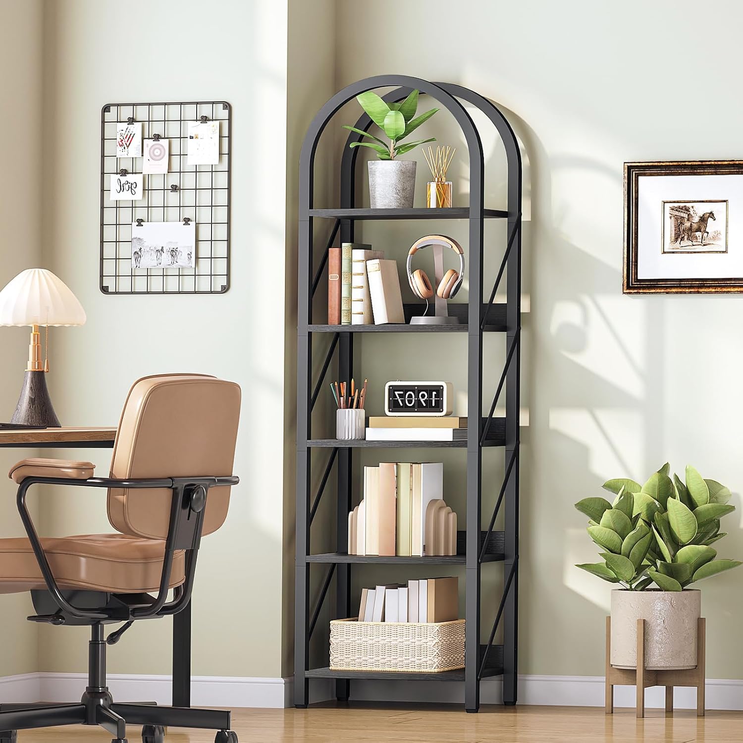 HOOBRO TV Stand with Power Outlets to 75 Inches, TV Console Table with Open Storage Shelves Cabinet, Industrial Media Entertainment Center for Living Room Bedroom HOOBRO Bookshelf, 5-Tier Bookshelf Arched Display Racks, Industrial Bookcase with Metal Frame, Book Shelf Storage Organizer for Living Room, Office, Bedroom