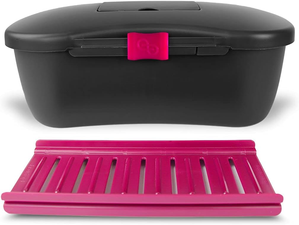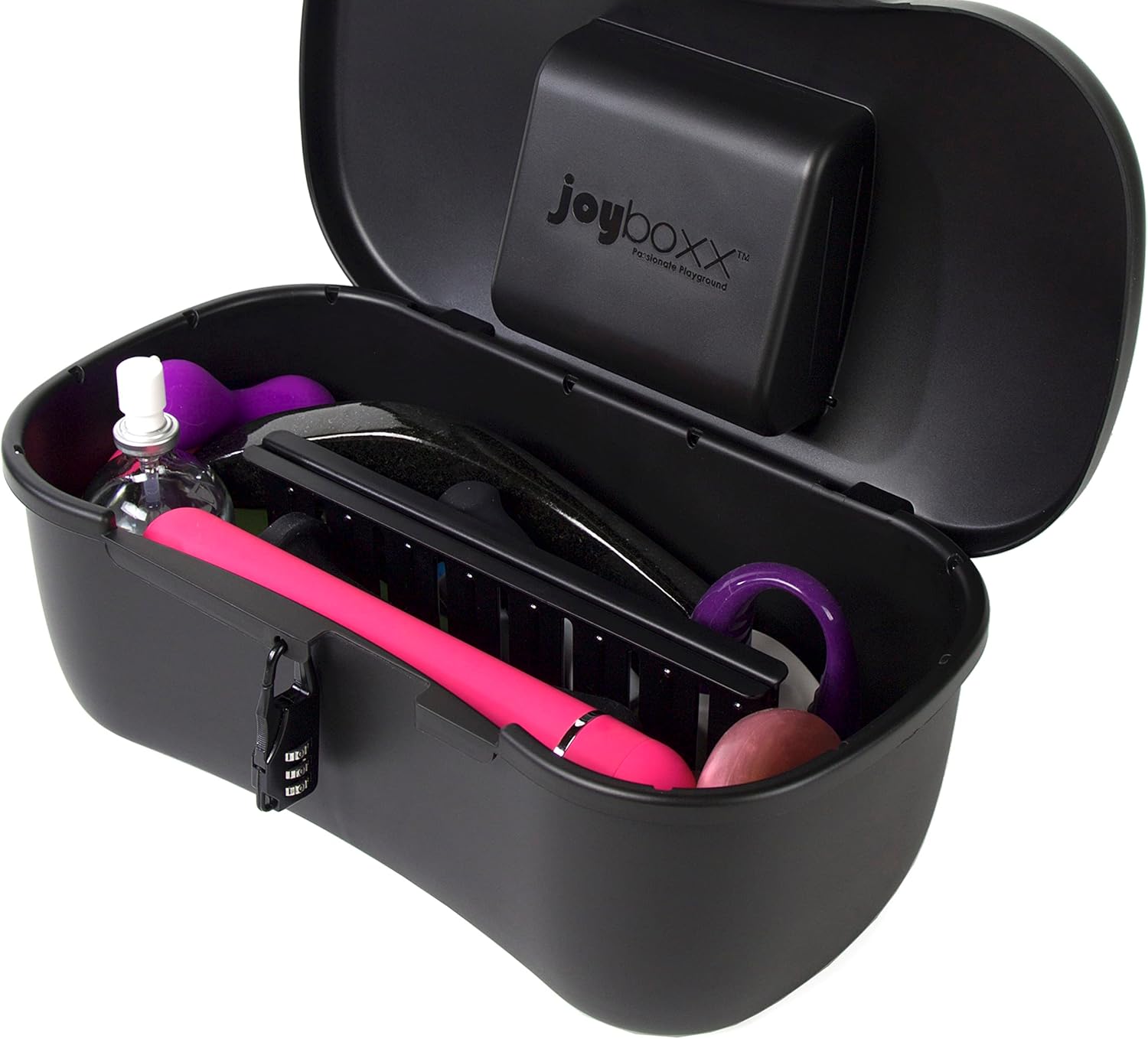 Limited Edition Black and Barbie Hot Pink storage lock box. Made in the USA. The Joy's Inside! Personal item protection for adult toys, medications, suppliments, secret stashes, hygiene products. The world's only patented, hygienic cleaning and locking system for personal item protection. BPA Free Pure Food-Grade Polypropylene - Dishwasher Safe