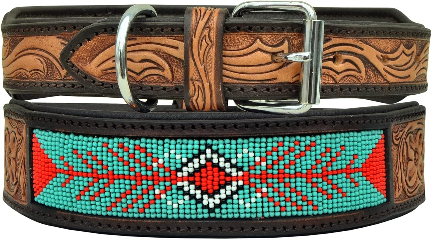 This beaded dog collar is artistically hand crafted, Hand Painted and hand finished by Artisans to give it a unique look and style. The collar is made up of very high quality genuine full grain cow leather and glass beads. It has a padded leather lining for your dog comfort. Best quality Cow leather and very high-quality silver finish stainless steel hardware is used in this collar to ensure that the collar is sturdy and last a long time.