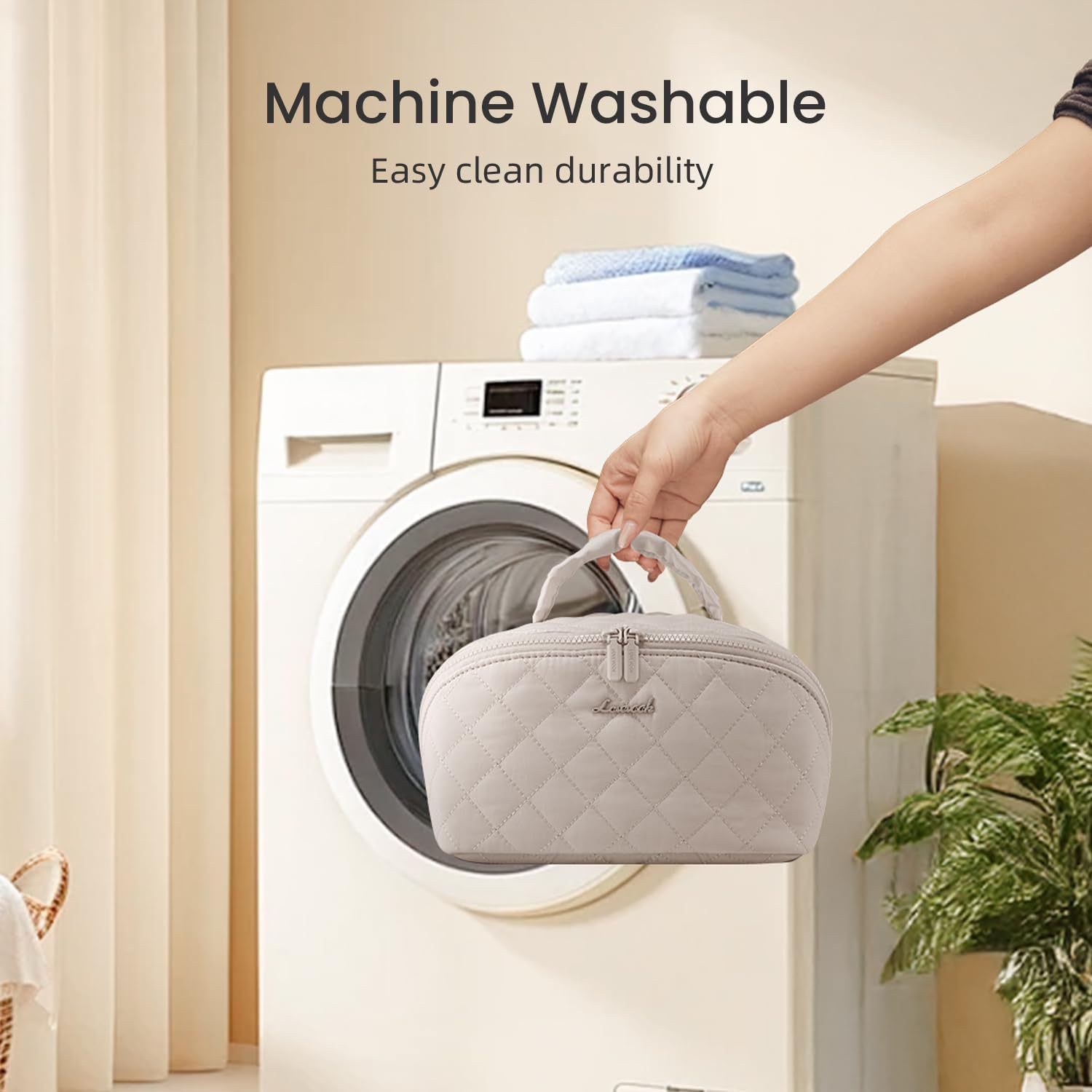 Experience confidence and elegance with our versatile makeup bag, tailored for stylish and sophisticated women on the go. Whether in a cozy bedroom or on a leisure trip, this bag is more than an accessory; it's a statement of modern sophistication and efficiency.Features:180° Lay-Flat Design: Easily access your essentials with a spacious, multi-pocket setup, ideal for full makeup storage.Wide-Open View: Organize effortlessly with designated areas for brushes, air cushion, care products, toner, and eyeshadow palettes.Soft and Machine-Washable Fabric: Cloud-soft, gentle cushioning offers peace of mind with easy maintenance.Size Options: Travel light with a small bag or fit your full makeup collection in a large bag, perfect for any adventure.Specifications:Material: Cotton FillingWeight: Approximately 0.40 lbsProduct Size: 9.8" L x 5.5" W x 5" HAdditional Bag Size: 5.2" L x 5.2" WNote: Please allow slight dimension differences due to manual measurements.