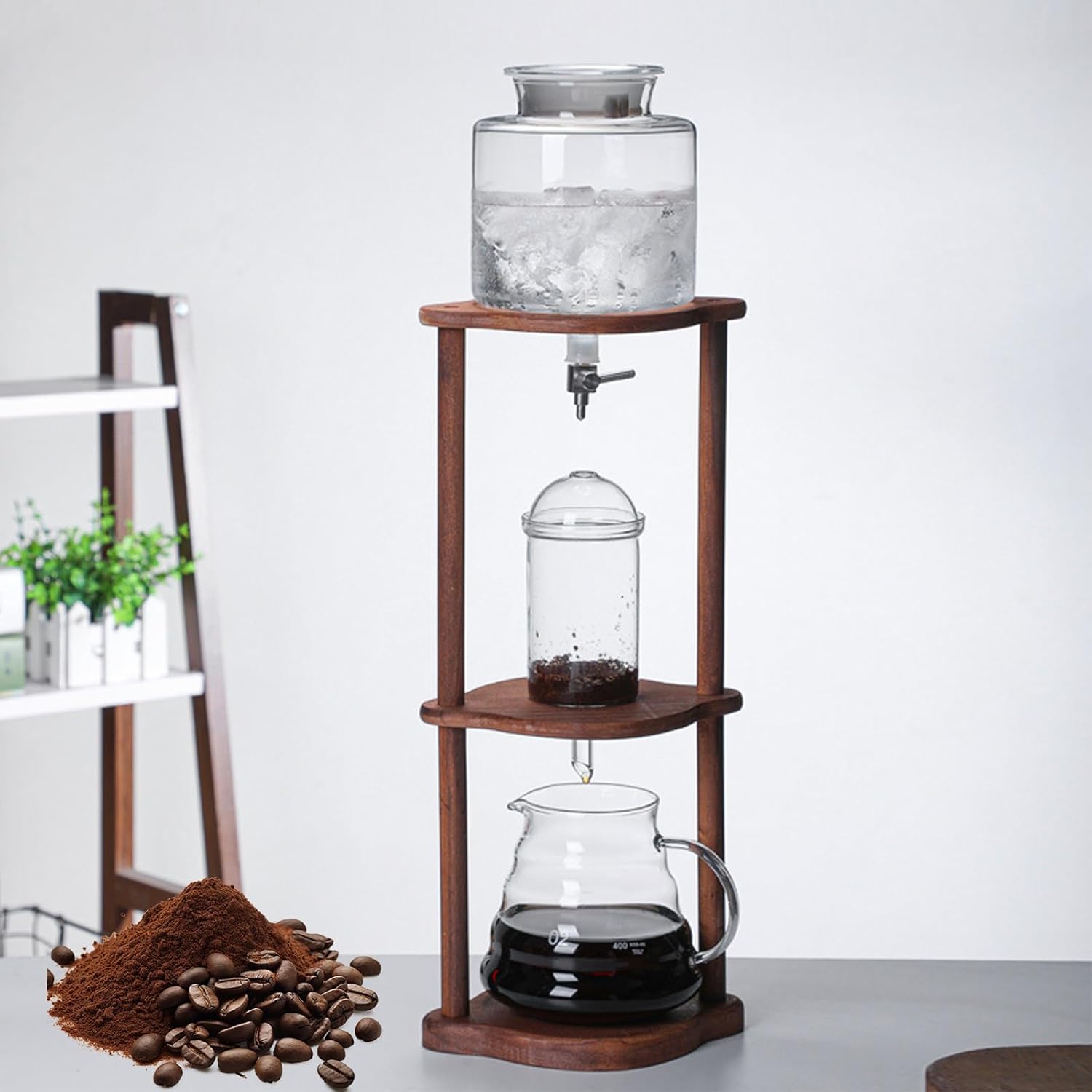 Regulable Dripper: The cold brew drip tower has an regulable dripper to precisely control the speed of the ice drippingDIY Making: You can DIY your own coffee using the ice coffee brew tower, which controls the timing and taste to your likingScope of Application: The elegant cold brew coffee set is suitable for home and kitchen use, meeting your daily coffee making needs1. Add medium ground coffee powder to the filter, adjusting the ice water to powder ratio to your preference.2. Replace the lower pot, making sure the water inlet aligns with the faucet.3. Fill the upper pot with ice cubes and ice water.4. Fine-tune the valve to regulate the dripping speed for a consistently smooth brew.5. Reassemble the components and fill the water tank with cold water.6. Transfer your freshly brewed cold brew coffee into a sealed bottle for later enjoyment.Product Details:Materials: heat-resistant glass, wood, stainless steel, PPDimensions: 38.5*26.5*110cmPackage Includes:1 x Iced Coffee MachineElevate your coffee brewing routine with the convenience and sophistication of our iced coffee machine. Treat yourself to a refreshing cup of cold brew coffee by ordering yours today!