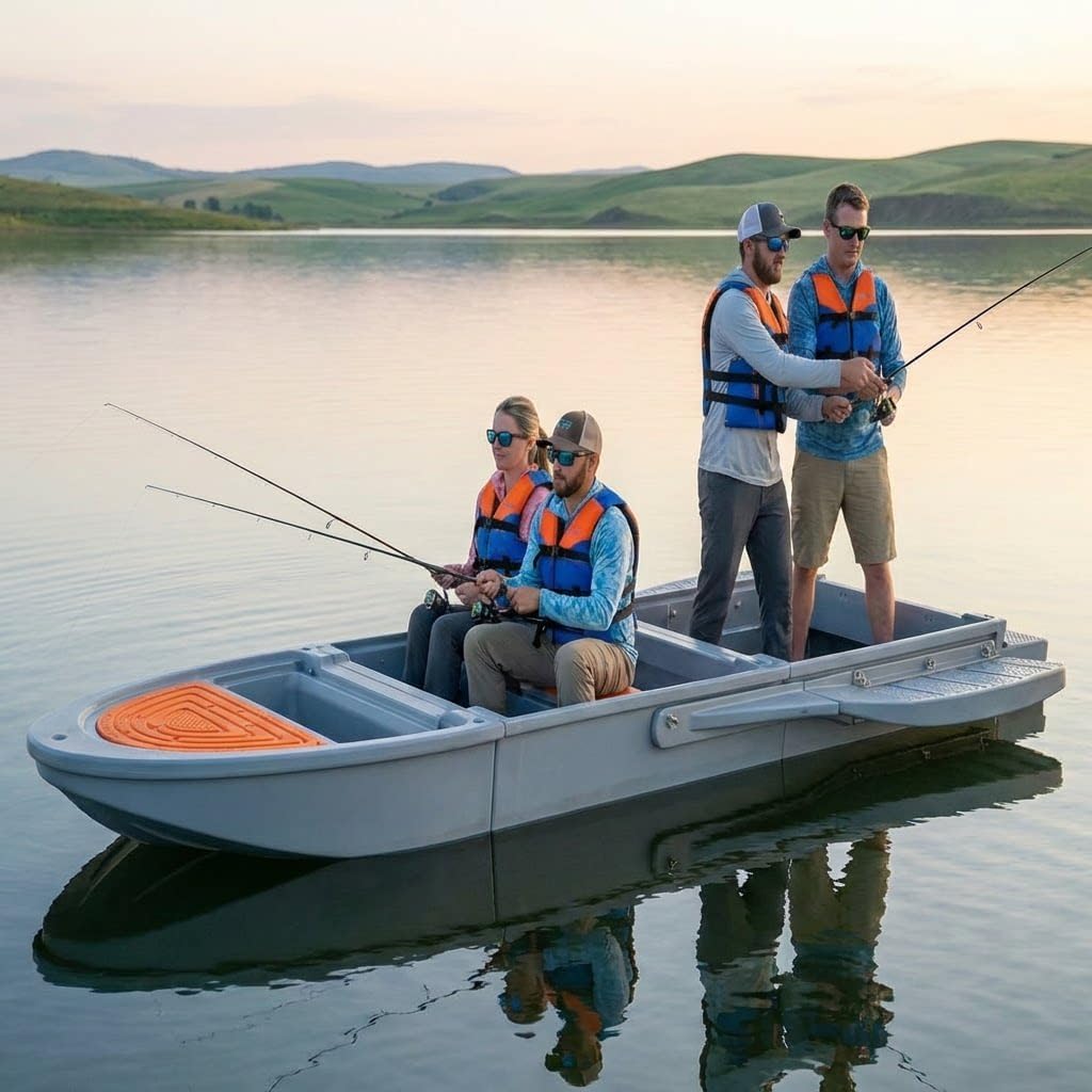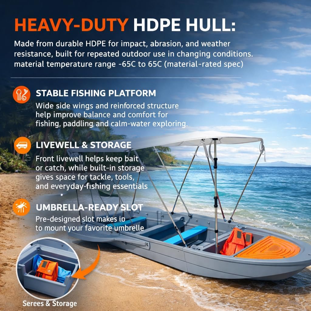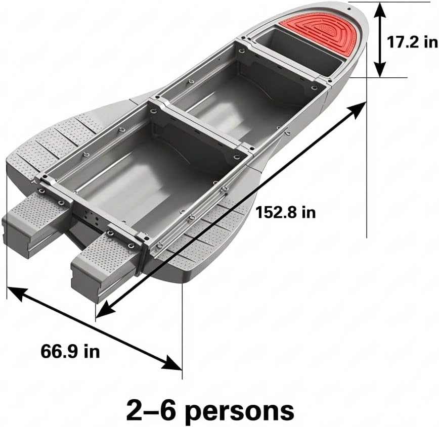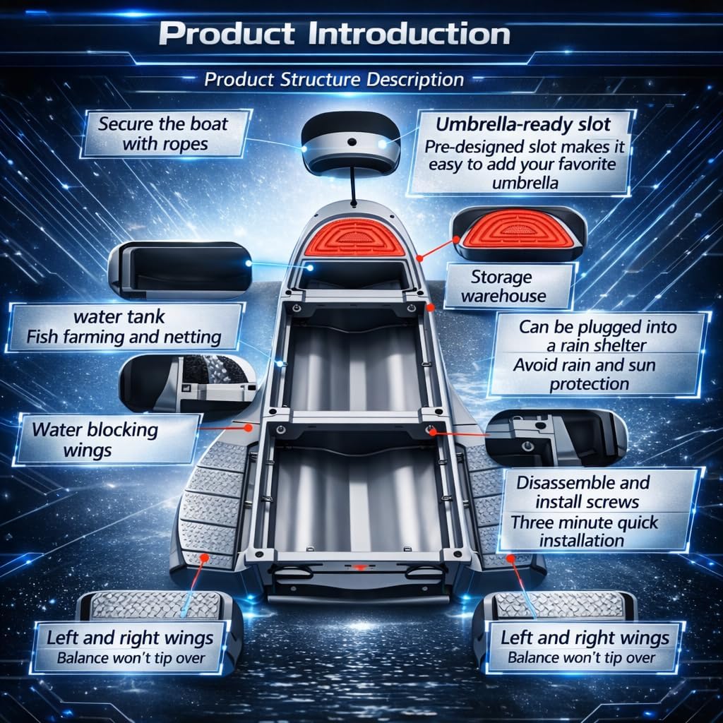 Portable Modular Fishing Boat for Outdoor Adventures The Womfontra modular fishing boat is designed for anglers and outdoor enthusiasts who want a stable and portable fishing platform without the hassle of trailers. Its innovative 3-section modular design allows the boat to be easily transported in the trunk of an SUV or pickup bed, making it perfect for remote fishing locations and spontaneous outdoor trips. Constructed from high-density polyethylene (HDPE), the hull provides excellent impact resistance, corrosion resistance, and long-term durability. The reinforced structure and wide stabilizing side wings improve lateral balance, giving anglers a safer and more comfortable fishing experience. Whether you're lure fishing on lakes, exploring quiet ponds, hunting waterfowl, or enjoying relaxed paddling, the Womfontra folding fishing boat offers versatility and reliability for a wide range of outdoor activities. Note: Motor/outboard is NOT included. A reinforced stern mounting area is provided for customer-installed motors if desired. The canopy is also not included; a canopy socket is provided for compatible add-ons. Use on calm waters only, wear a PFD at all times, and follow local regulations.
