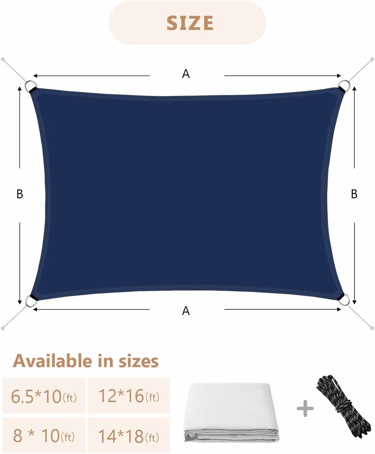 Material: 100% polyester (waterproof Oxford cloth) Product Size: 6.5x10 ft (198x304cm) 8x10 ft (244x304cm) 12x16 ft (365x488cm) 14x18 ft (426x549cm) Packing Contents: 1 Sun Shade Sails, 4 wind rope with 9.8ft long PRODUCT FEATURES: Efficient Sun Shading: This high-quality sun shade sail can block over 90% of harmful ultraviolet rays and direct sunlight, effectively protecting users from the harm of sunlight and ultraviolet rays. Waterproof: The sunshade sails are made of high-quality waterproof Oxford cloth, which has excellent water resistance and can insulate most of the rain. Easy to Install: This product comes with stainless steel D-shaped buckle in the four corners, equipped with 4 windproof ropes, only need to fix the fixed point and D-shaped buckle with a rope to complete the installation. Applicable Scenarios: Perfect for yards, gardens, swimming pools, barbecue areas, beaches, outdoor lawns or any outdoor space that needs shade. Our sun shade not only provide waterproof insulation and UV protection for your outdoor activities, but also provide you with privacy. Washing Instructions: This product can be machine washed or hand washed. Do not use bleach during cleaning to avoid damaging the surface of the product. Please use a low-temperature iron for ironing, as excessively high temperatures can cause damage to the product.