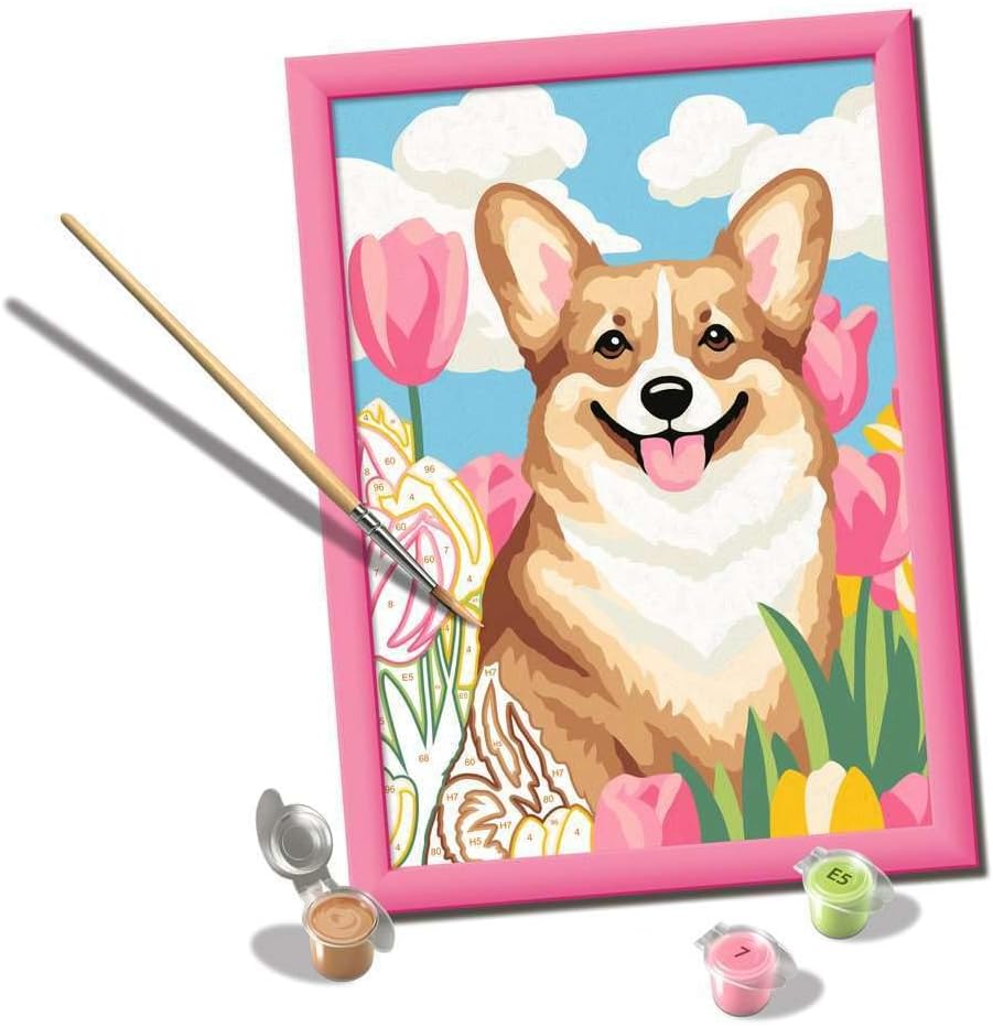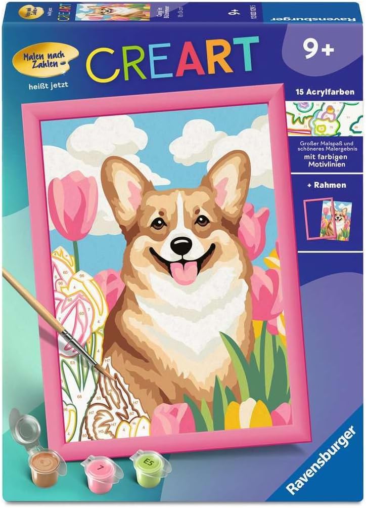 Product Description Coloured motif lines: greater colouring fun and a more beautiful result. Thanks to the coloured motif lines, children can see the whole motif Corgi in the sea of flowers and the colours faster. The brush has good guidance and thus creates a perfect picture. The beautiful motifs for colouring are a great gift idea for children aged 9 and over and a beautiful decoration. This painting set contains 15 ready-mixed acrylic paints. Packaging design may vary. Manufacturer Contact Information service@ravensburger.de; service@ravensburger.de