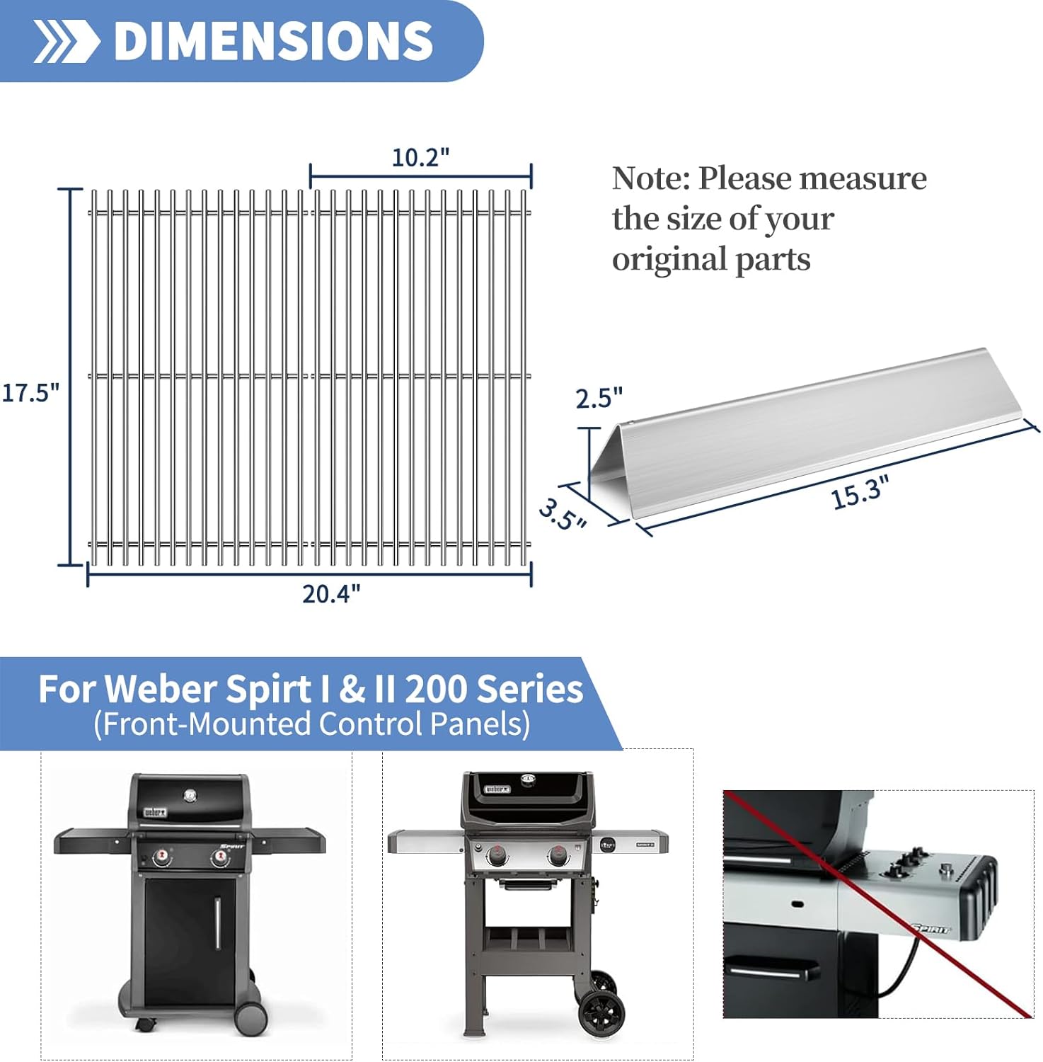Description:Material:The Cooking Grids Thickness is 7MM, more thicker than other 5MM Grates,Flavorizer Bars Made of Heavy Duty Stainless steelStainless steel material hold heat well and rust-resistant than regular stainless steel grates, cooking food quickly and evenly.Dimensions: Flavorizer Bars For Weber Spirit 17.5 x 10.2 Inches for 2pcs total. Stainless steel Flavorizer Bars of Weber Spirit grill parts: L 15.3" x W 3.5" x H 2.5Grate COMPATIBLE For or weber Spirit I & II 200 Series gas grills with front-mounted control panels (2 Burners): Spirit E-210, S-210, E-220, S-220 (model years 2013 and newer).Fits Weber Spirit 200 Series 2013 Models E-210 46110001 E-220 46310001 S-210 46100001 S-210 47100001 .Fits Weber Spirit 200 Series 2014 Model E-210 46113101 46110001 46010074 46010674 46510001 4710001Package includes: 2-Pack cooking grids grates.3 pcs Flavorizer Bars