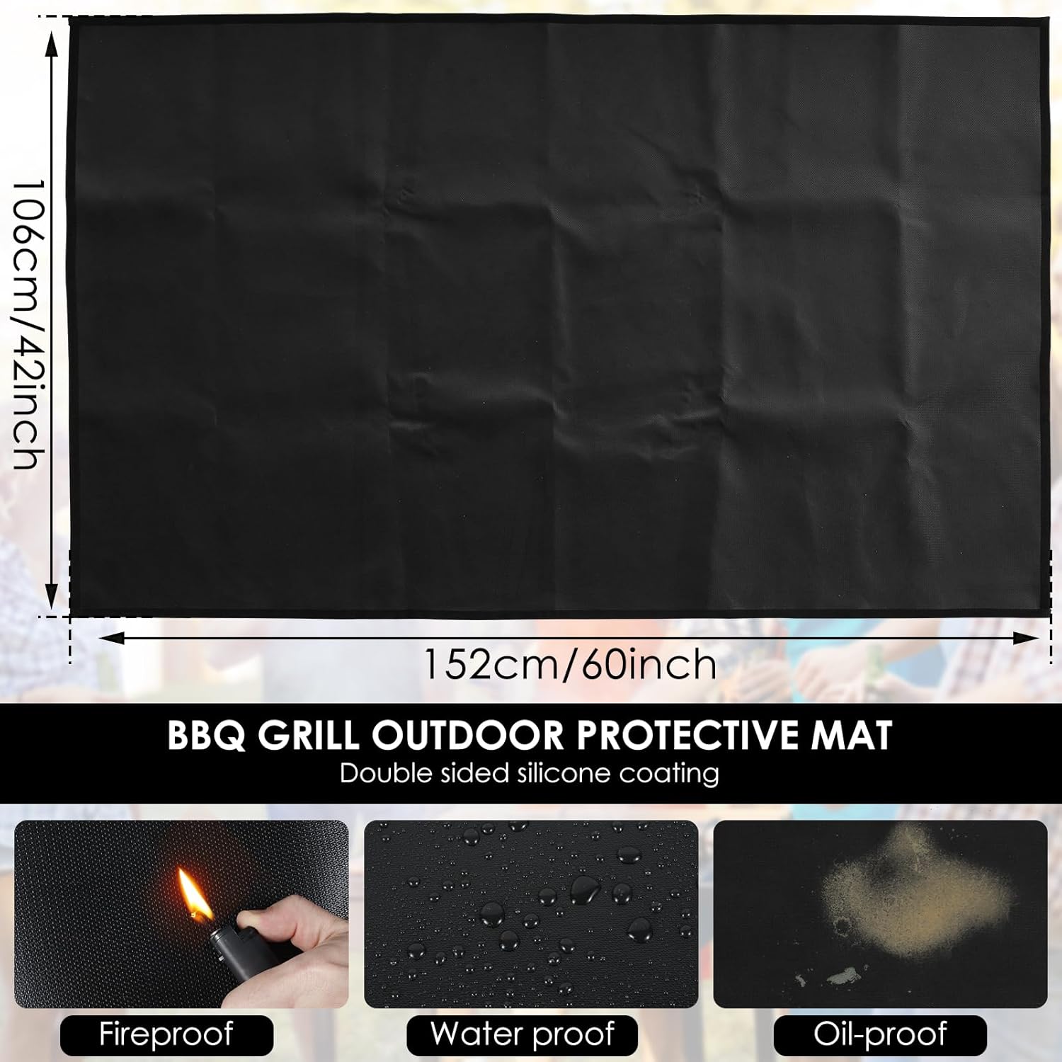 Parts List:Under Grill Mat x 1Description:This grill pad is of fiberglass and evenly coated with heat-resistant silicone on both sides, making it fireproof, waterproof, and oilproof. Waterproof and effortless to clean, simply rinse with soap and water or a hose, conveniently folds for compact storage. for gardens, patios, lawns, and other outdoor barbecue sites.Key Feature:Double-sided Silicone Coating: This fireproof mat is of advanced fire-resistant materials, of fiberglass, with double-sided heat-resistant silicone coating, heat-resistant up to 2000°F.Effortless to Clean: To clean this barbecue mat, simply soap and rinse with a hose or wipe with a damp towel.Specification:Product Name: Under Grill MatProduct Size:about 122x76cm/48x30inOrabout 165x99cm/65x39inOrabout 152x106cm/60x42inProduct Material: FiberglassNote:1. There may be slight differences between the picture and the actual color of the commodity. We will try our best to show you the exact color.2. Please allow slight dimension differences due to manual measurement.