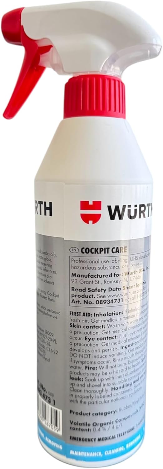Wurth Cockpit Care 500 mL Spray – Premium Interior Cleaner & Protectant for Plastic, Vinyl & Rubber Surfaces ✨ Transform your vehicle's interior with the Wurth Cockpit Care 500 mL Spray! This premium cleaner and protectant is designed to keep your car’s dashboard, door panels, and other plastic, vinyl, and rubber surfaces looking fresh and new. 🌟 Key Features: ✅ Cleans & Protects: Effectively removes dust, dirt, and grime while providing long-lasting protection against environmental factors. Keeps your surfaces looking pristine! 🧼🛡️ ✅ Satin Matte Finish: Leaves a sleek satin matte finish without any greasy residue, making your car’s interior look refined and well-maintained. ✨ ✅ Fresh Fruit Scent: Enjoy a refreshing, pleasant scent that lasts for hours, enhancing your driving experience with every ride. 🍏🍊 ✅ Eco-Friendly Formula: Over 95% biodegradable ingredients, free from solvents and silicone, making it safe for both your car and the environment. 🌍♻️ ✅ Multi-Surface Use: Perfect for plastic, vinyl, and rubber surfaces in your car, truck, or SUV. Ideal for dashboards, trims, seats, and more! 🚗💺 How to Use: Shake the bottle well before use. Spray directly onto a microfiber cloth (not directly onto the surface). Gently wipe the cloth over the surfaces of your vehicle interior. Enjoy a rejuvenated, clean, and fresh interior with a satin matte finish! 🎉 Keep Your Vehicle Looking Its Best! 🌟 Protect your interior surfaces from wear, cracking, and fading with Wurth Cockpit Care 500 mL Spray. Elevate your car care routine and enjoy a refreshed, spotless interior every time you drive! 🚙✨