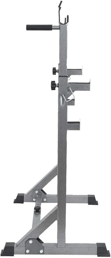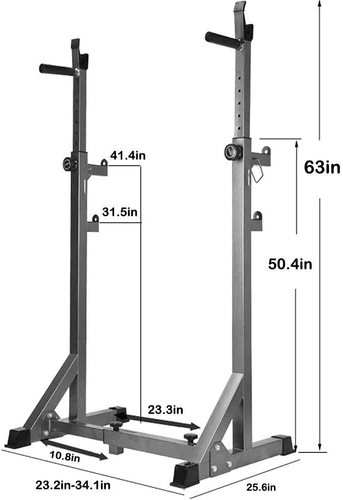 Specification: Material: Steel, PP Color: Silver Overall product dimension: 59-86.5x65x128-160cm/23.2”-34.1”x25.6 x50.4”-63” (L) x (W) x (H) Adjustable Height: 128-160cm/50.4”-63” Width to adjust: 59-86.5cm/23.2”-34.1” Height of two bench press stands: 80cm / 31.5” (top), 105cm / 42.5 ”(bottom) Weight capacity: 300kg/660lbs Director: 50 x 50 x 1.5mm/2”x2”x0.06” Intubation: 45 x 45 x 1.5mm/1.78”x1.78”x0.06” Package size: 107.5x61.5x11.5 cm Gross weight: 17kg Package include: 1xBarbell rack 1x manual