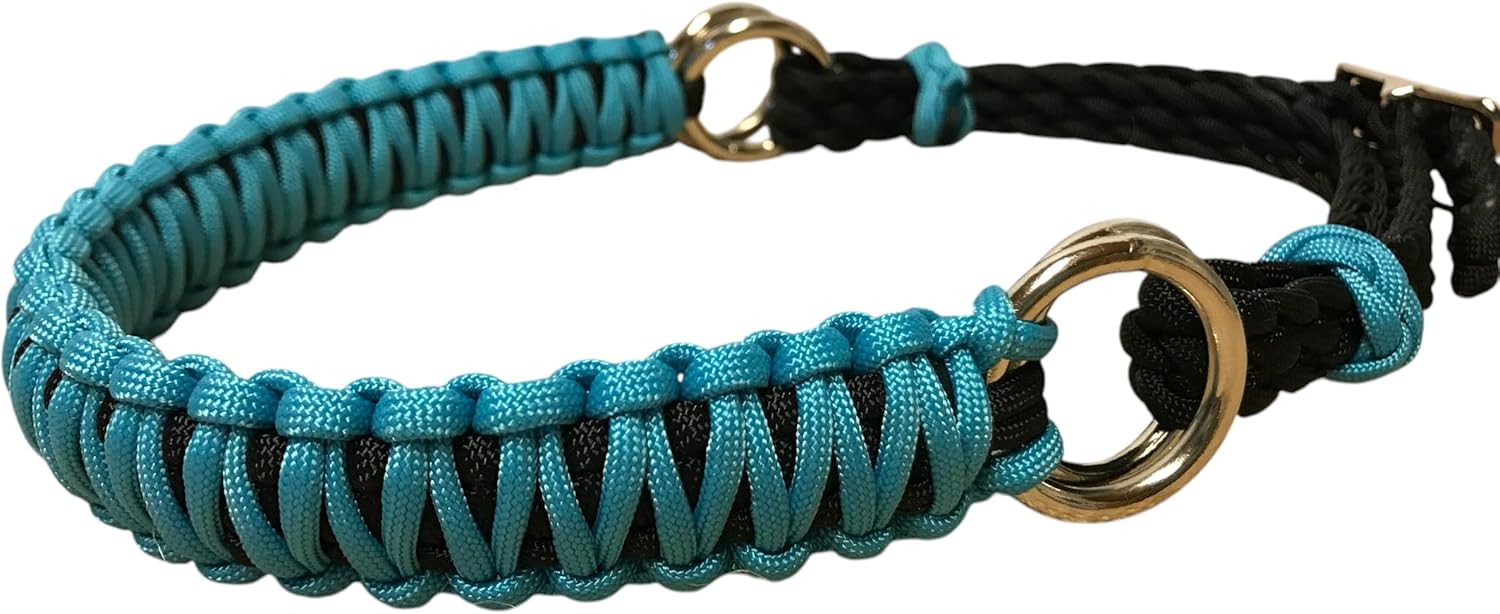 This is a braided side pull hackamore attachment that attaches to your own headstall. It is braided out of a high quality black 550 paracord with a neon turquoise noseband. The headstall attaches to one set of rings and your reins attach to the other set. This one does not tighten down on the nose when the reins are pulled back. The chinstrap is adjustable with a roller buckle. The noseband is neon turquoise and the chinstrap can be black or brown.